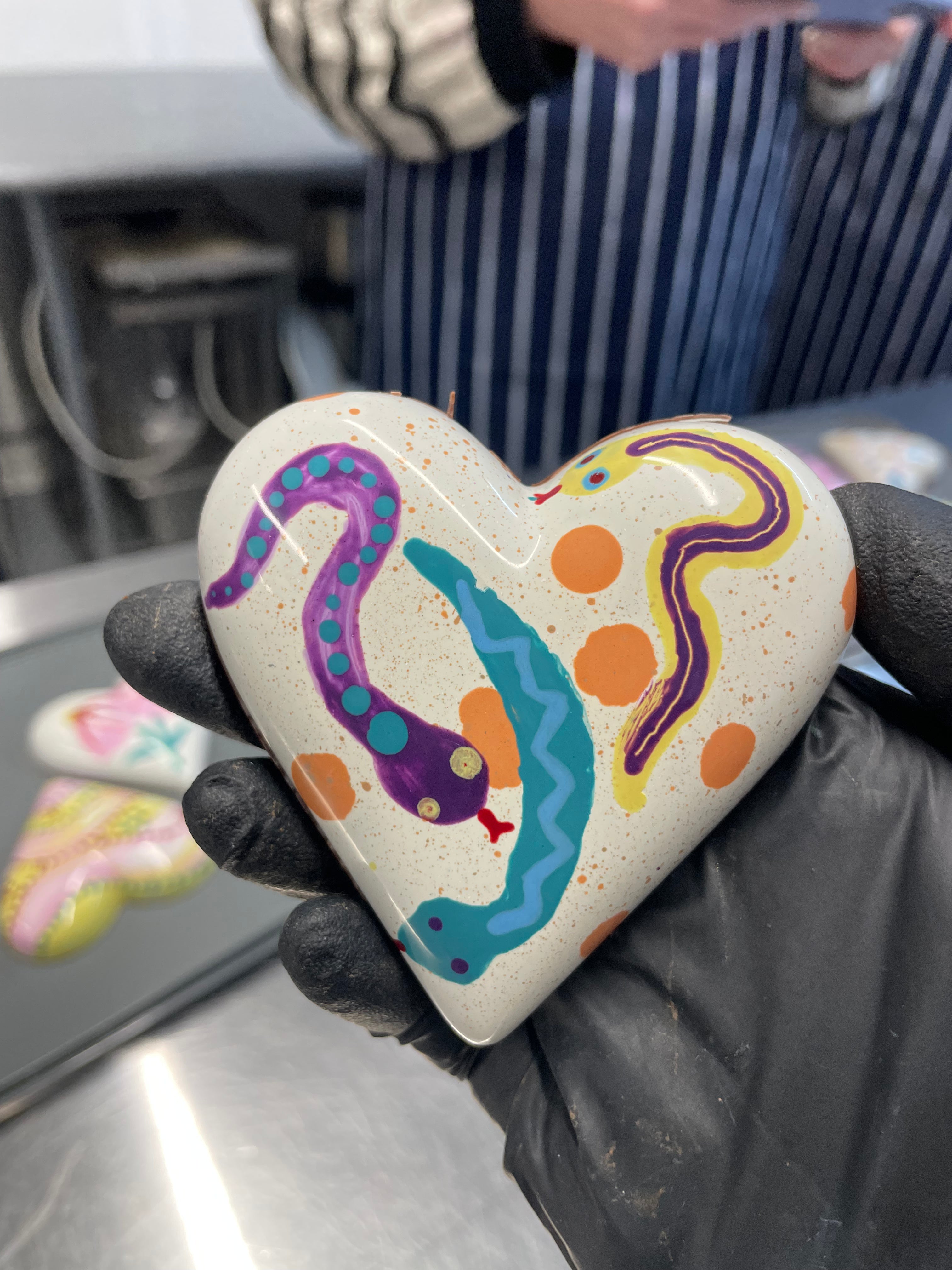 Hands-on Fun: Get ready to roll up your sleeves! Each student will be given a heart shaped mold with 5x cavities. You'll try your hand at every step of the process, decorating with coloured cocoa butter, shelling (filling the molds) to capping (sealing the chocolates) and, of course, eating.